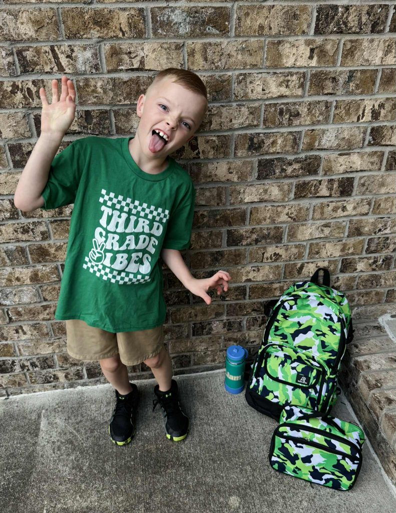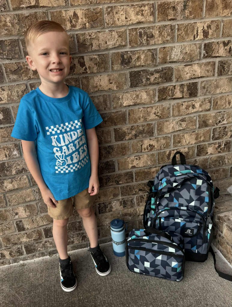 One of our favorite back-to-school traditions is picking out grade-level t-shirts for each child. It’s a simple but meaningful way to celebrate their milestone and capture the moment in first-day photos we’ll treasure forever. Each time they put them on, it’s a reminder of how much they’ve grown. This year, we even color-coordinated their shirts with their backpack/lunchbox so they can wear them throughout the year which is a fun twist that keeps the tradition going beyond the first day.