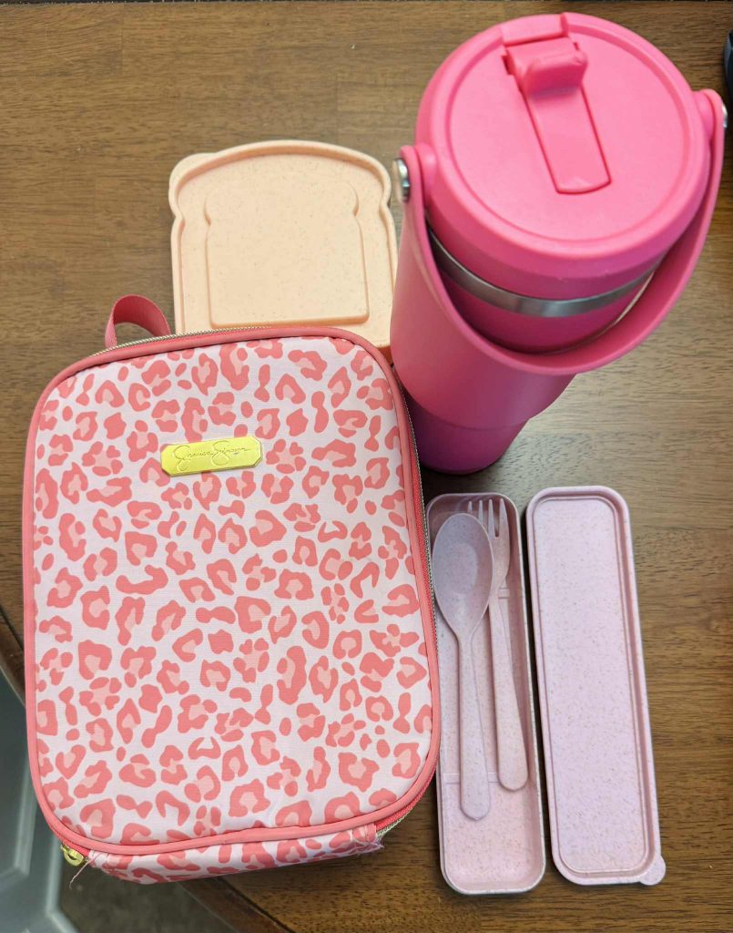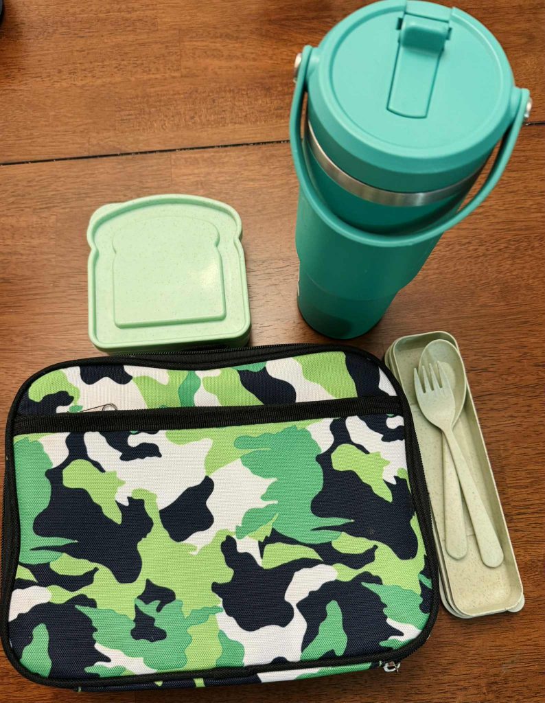 I found great little cutlery sets at Aldi. I removed the extra pieces like the knife, metal straw, straw brush, and chopsticks, then labeled them with their names. Now they stay in each of their lunchboxes every day, so I never have to worry about forgetting utensils for a meal. Every afternoon or evening, I wash their water bottles, sandwich containers from Amazon, reusable sandwich bags (I got from TJ Maxx, but they have them on Amazon), and utensils, so everything is clean, dry, and ready to go when I pack lunches in the morning. The color system keeps things organized and makes our mornings so much smoother since there’s no confusion about whose belongs to who.